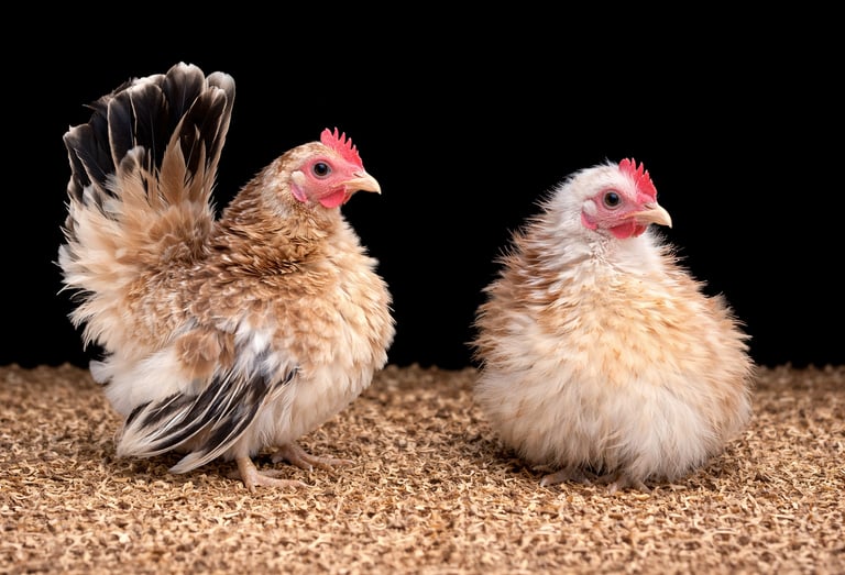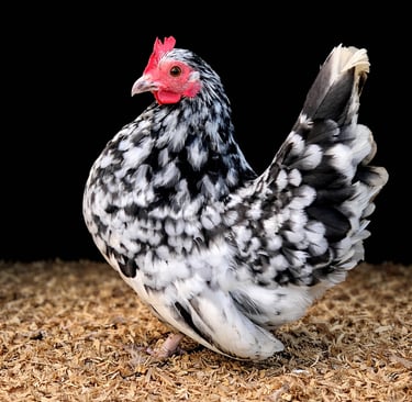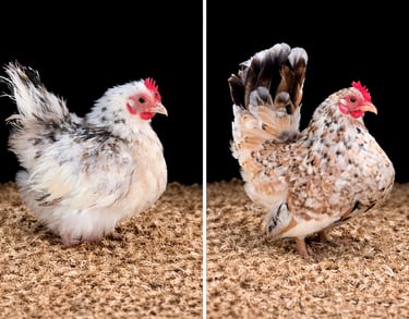 The Malaysian Serama is a remarkable true bantam, widely recognised as the smallest chicken breed in the world. It originated in Malaysia, particularly in the state of Kelantan. The breed was developed in the 1970s by Wee Yean Een, who selectively bred small local bantams to produce an even more compact and refined bird. The name “Serama” is thought to be derived from “Rama,” a reference to Thai royalty, reflecting the breed’s proud and upright stance. Over time, the breed gained popularity internationally, particularly in Europe and the United States, where it is now kept both as a show bird and as a companion animal. These tiny chickens are especially suited to small gardens or even indoor setups due to their extremely compact size and minimal space requirements. They come in a wide variety of colour, but do not 'breed true' meaning that it is hard to breed for a specific colour as you can in Pekins for example. However the diversity is what makes keeping and breeding Serama such fun. You never know what you will get. The colours and shape make them visually striking despite their small stature.